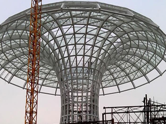 二、球形网架结构因其结构新颖,受力合理,自重轻、用钢量低等优点。如大型体育场馆球形螺栓球网架、公共场馆球形网架、电厂螺栓球网架、水泥工业球形网架、仓储物流球形网架、干煤棚工业球形网架、收费站加油站球形网架、展览中心、影剧院、商场、航站楼、候车厅、工厂车间、仓库、电视塔等球形螺栓球节点网架。国内球形网架结构主要分为:焊接球节点网架及螺栓球节点网架两种。螺栓球节点网架其构件工厂内加工量较大,现场安装便捷,适用于现场工期紧,施工条件、用电量受制约,网架形状复杂、杆件定位困难的异形结构。螺栓球节点球形网架系统基本由杆件、螺栓球、支撑支座等组成。按照节点形式可分为交叉桁架体系、四角锥体系、三角锥体系等。支撑方式多为固定支座支撑。对于大面积、大跨度及有特殊受力或伸缩要求的网架结构可采用橡胶支座、滑移支座、球铰支座等支撑形式,以满足结构自身的受力稳定、均衡,便于内力释放等设计要求。